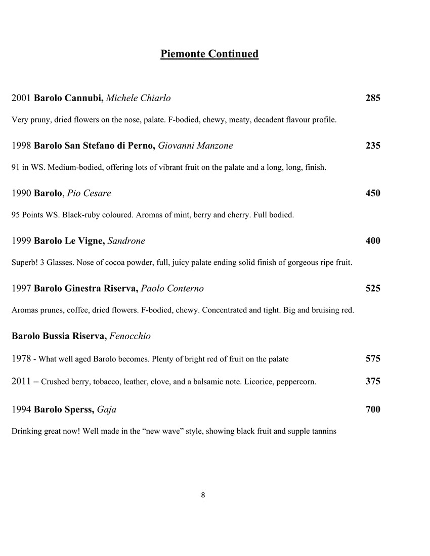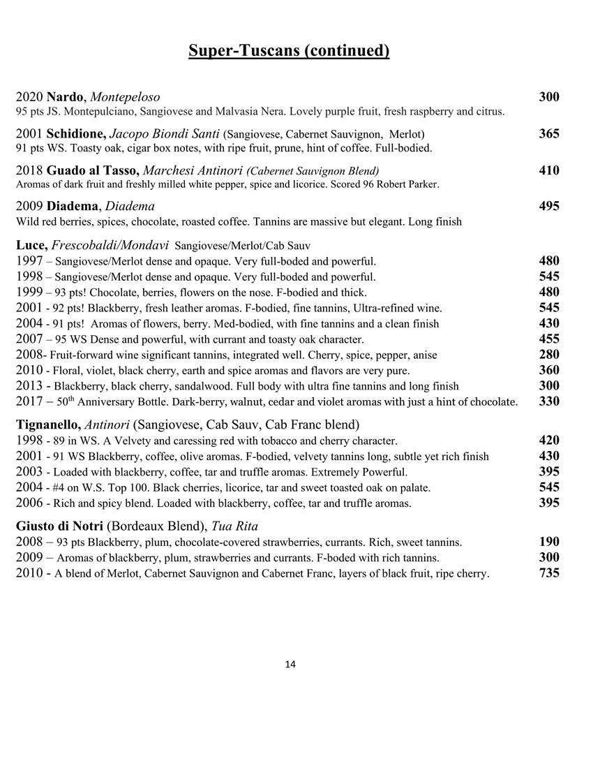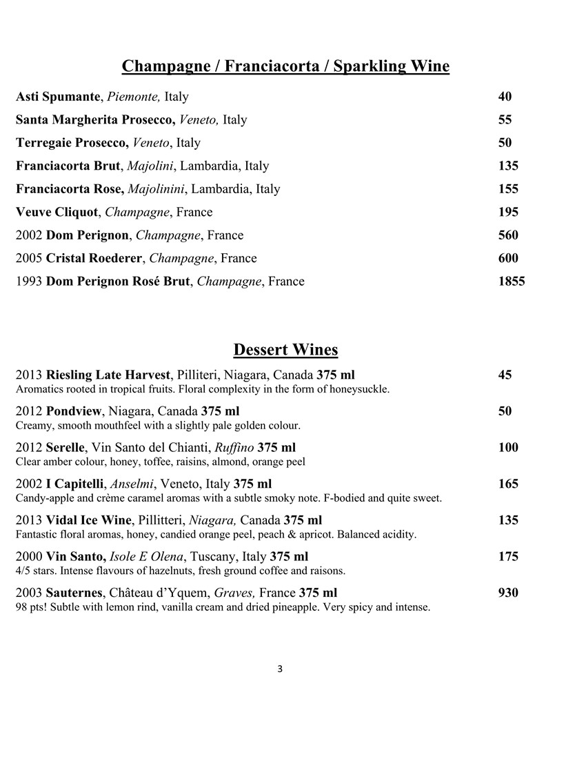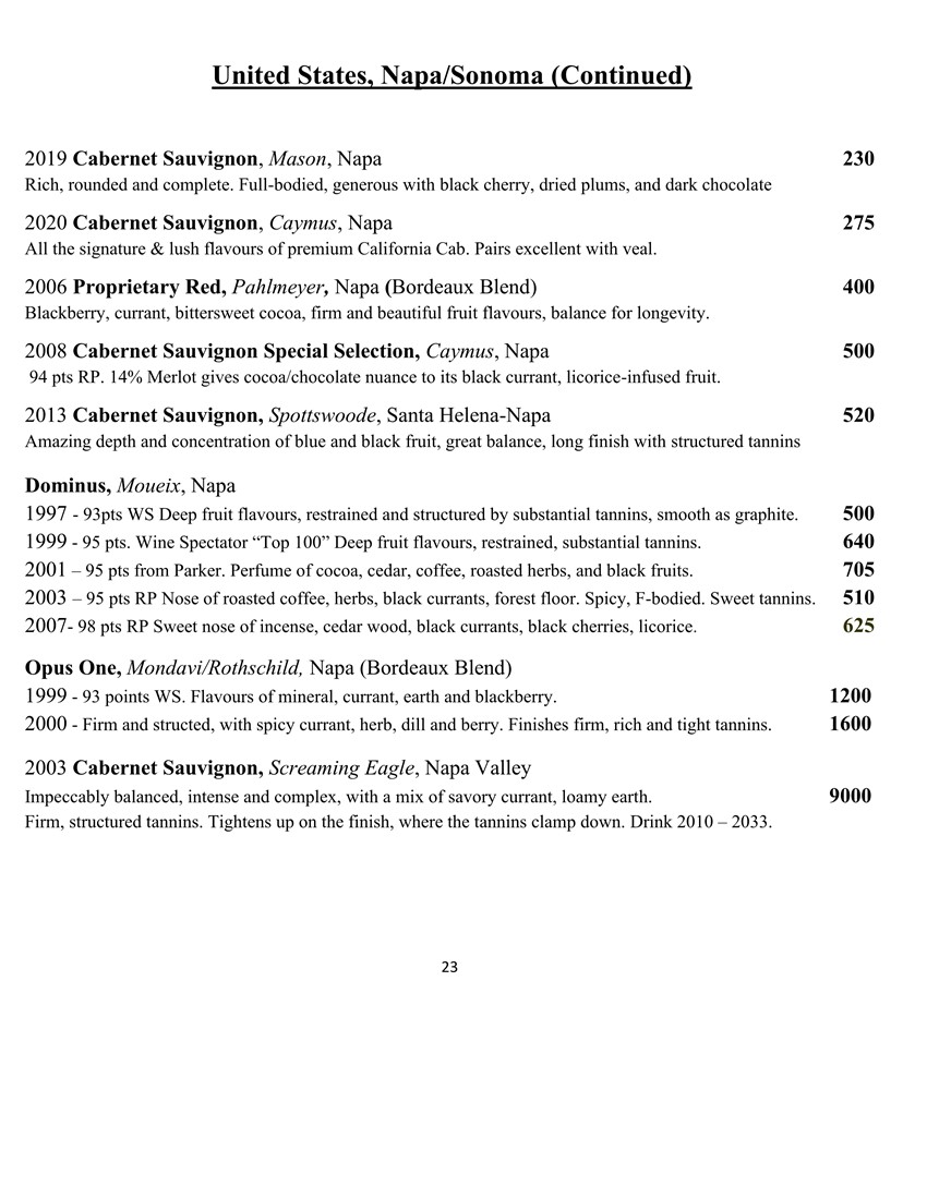 Please note that our vintages and prices are subject to change. Consult the wine list in the restaurant for the current menu. Thank you.